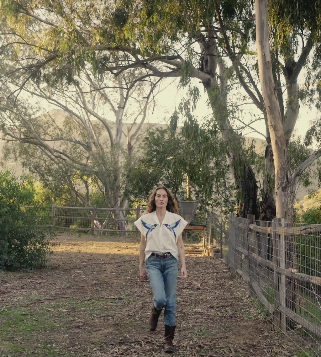 Crafted from 100% GOTS certified organic cotton, the Ariel Blouse is a short sleeve button down designed with thoughtful, feminine details. Featuring a delicate embroidered bird at the front and a soft pleat at the back, it’s finished with an easy, relaxed silhouette for a polished look.