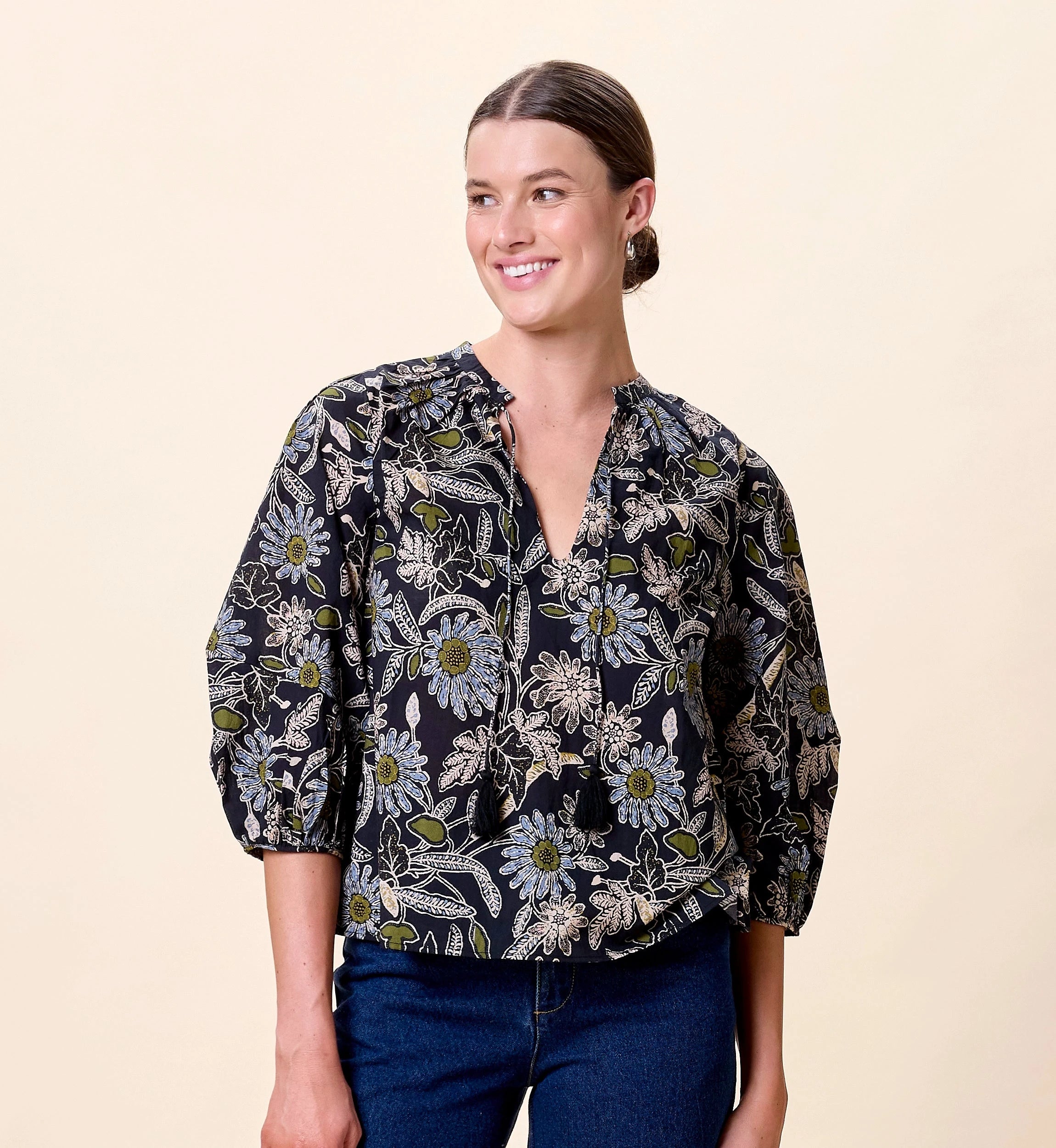 Effortlessly chic and sustainably crafted, the Belle Blouse is ethically handmade in India from 100% GOTS-certified organic cotton mulmul. This lightweight, breathable top features a relaxed silhouette with 3/4-length sleeves, a stylish neck tie, and delicate tassel details at the ends. Designed in our classic Magnolia print in a dark hue, this versatile blouse easily transitions from casual daytime looks to elevated evening outfits.