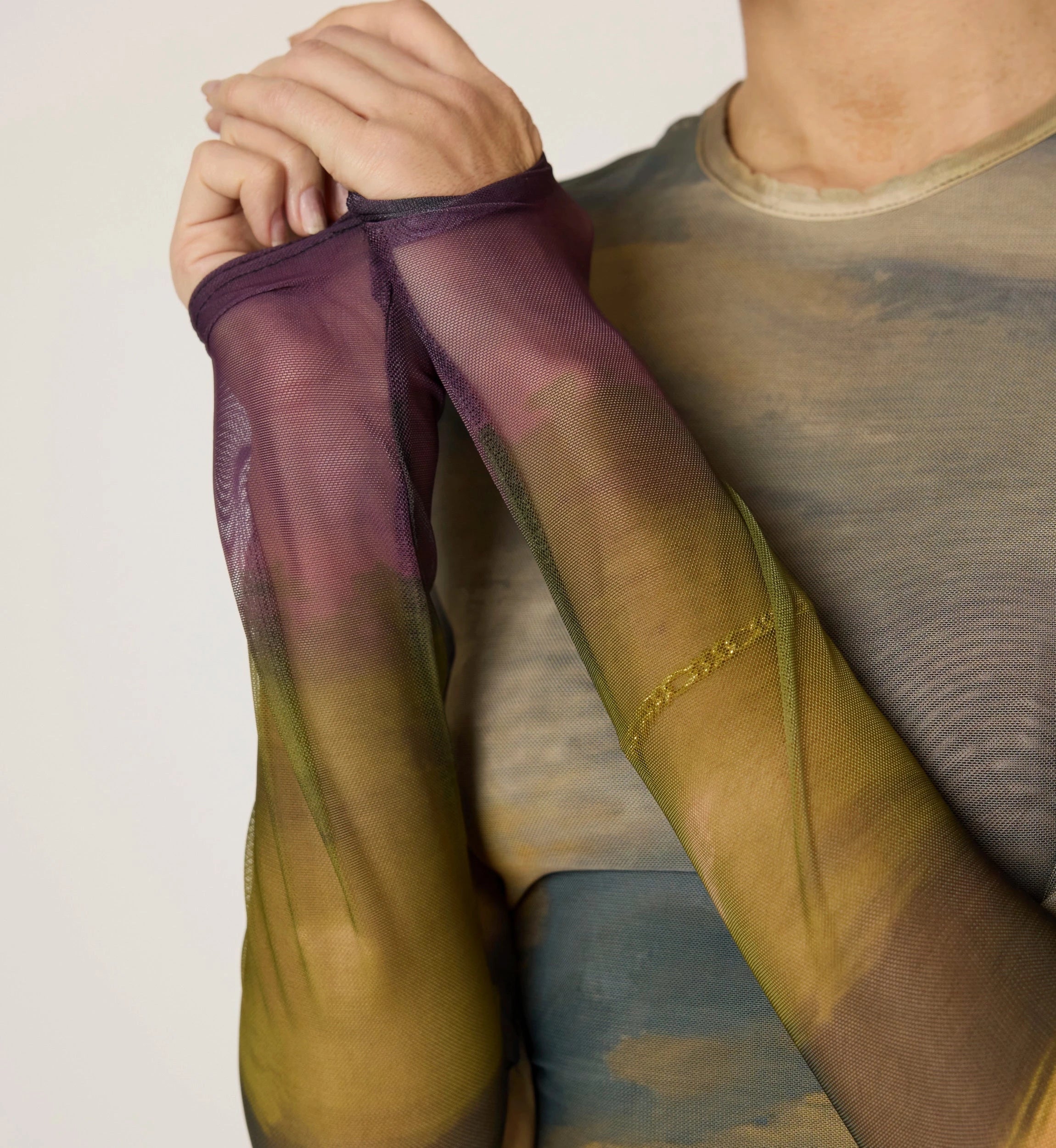 Ethically handmade in India from 88% recycled nylon and 12% elastane, the Dawn Top is a sustainable statement piece for your fall wardrobe. This fitted mesh long-sleeve top features a one-of-a-kind hand-painted design, blending artful detail with modern versatility. Style it with denim for an everyday look or layer it under a blazer for an elevated edge.