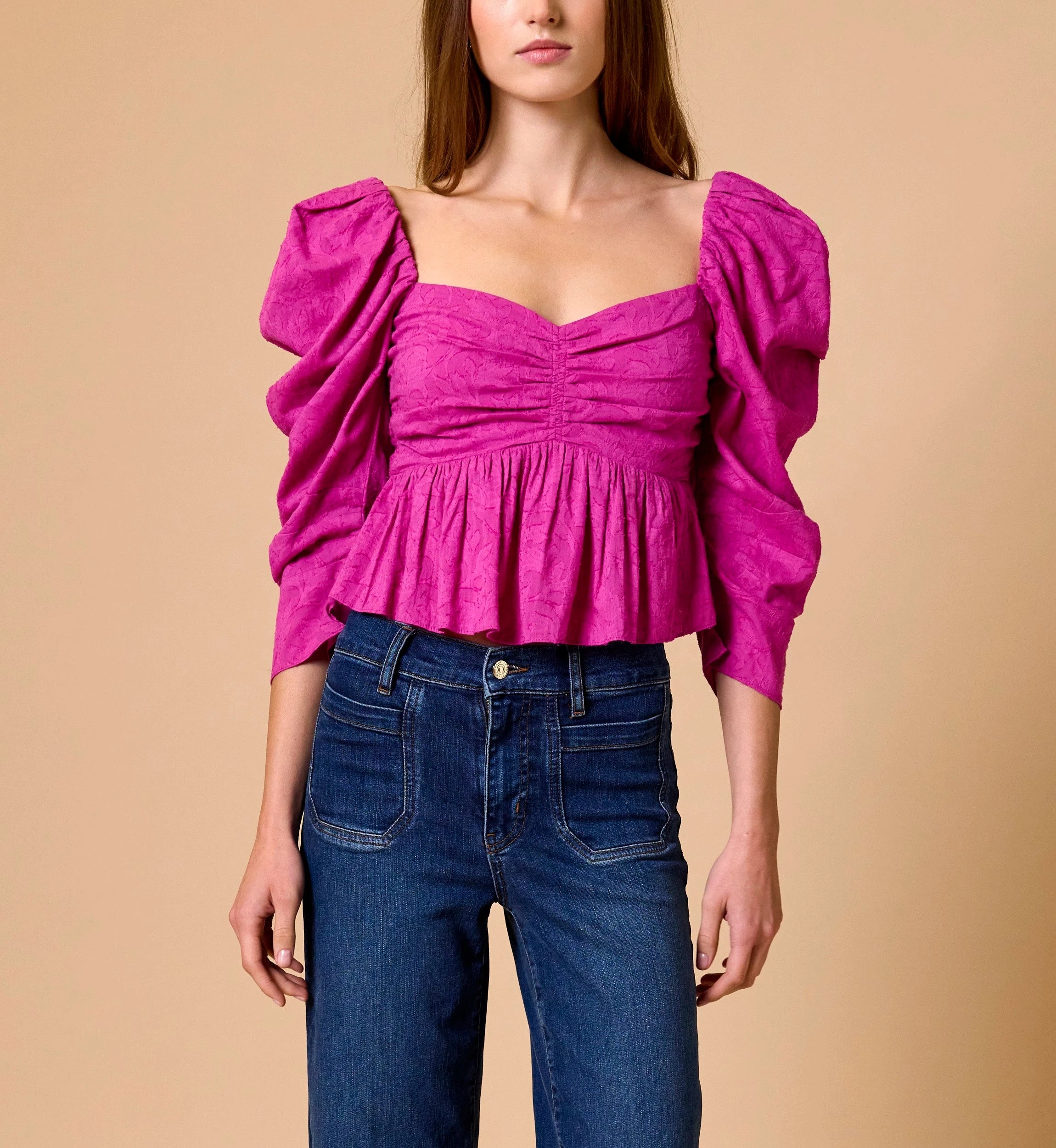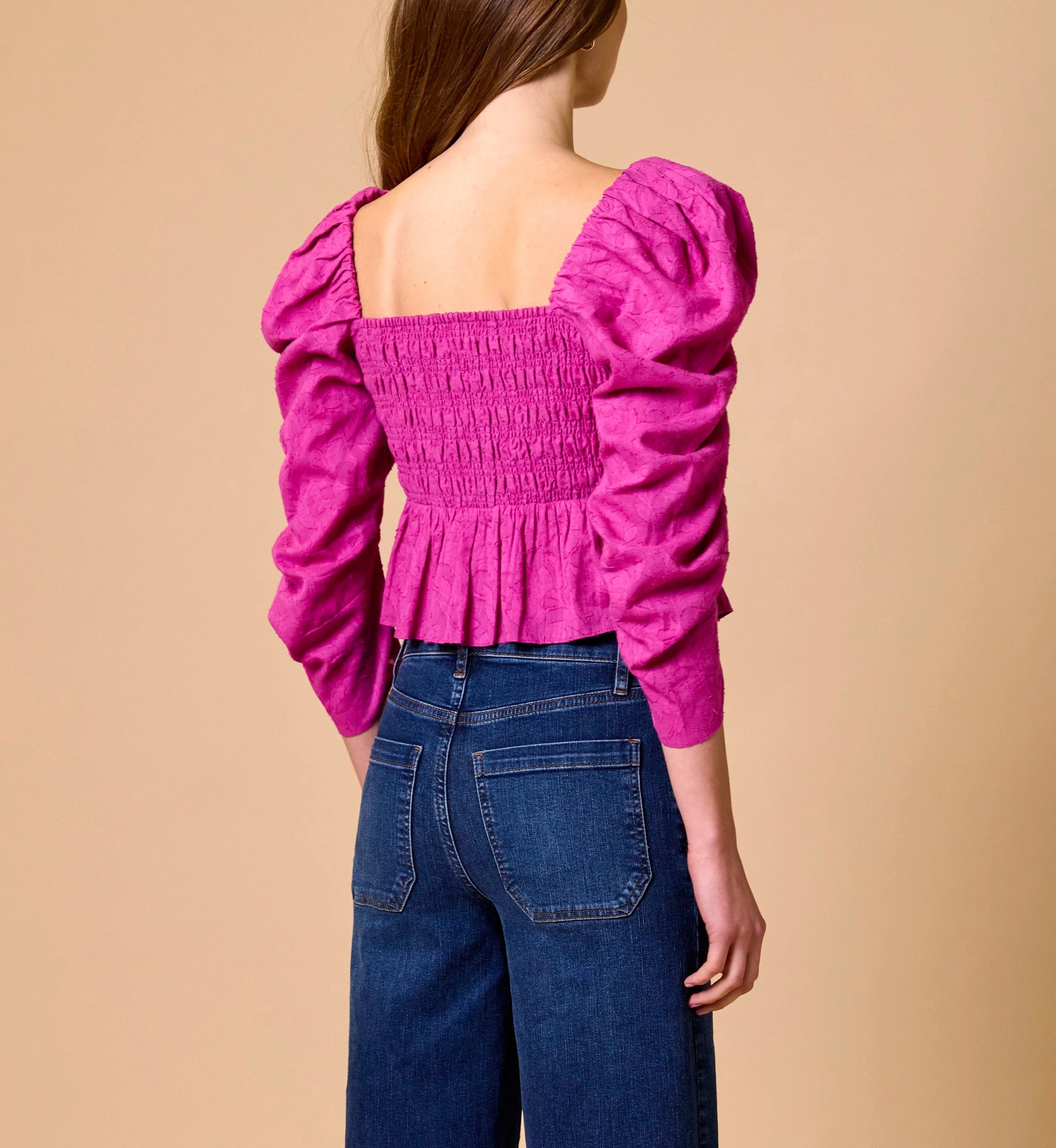 Made from soft cotton jacquard, the Dulce Blouse shines in a vibrant fuchsia red. Designed with 3/4 puff sleeves, shirring at the bust, and smocking at the back, its cropped silhouette offers a flattering, feminine fit that’s effortlessly chic for any spring occasion.