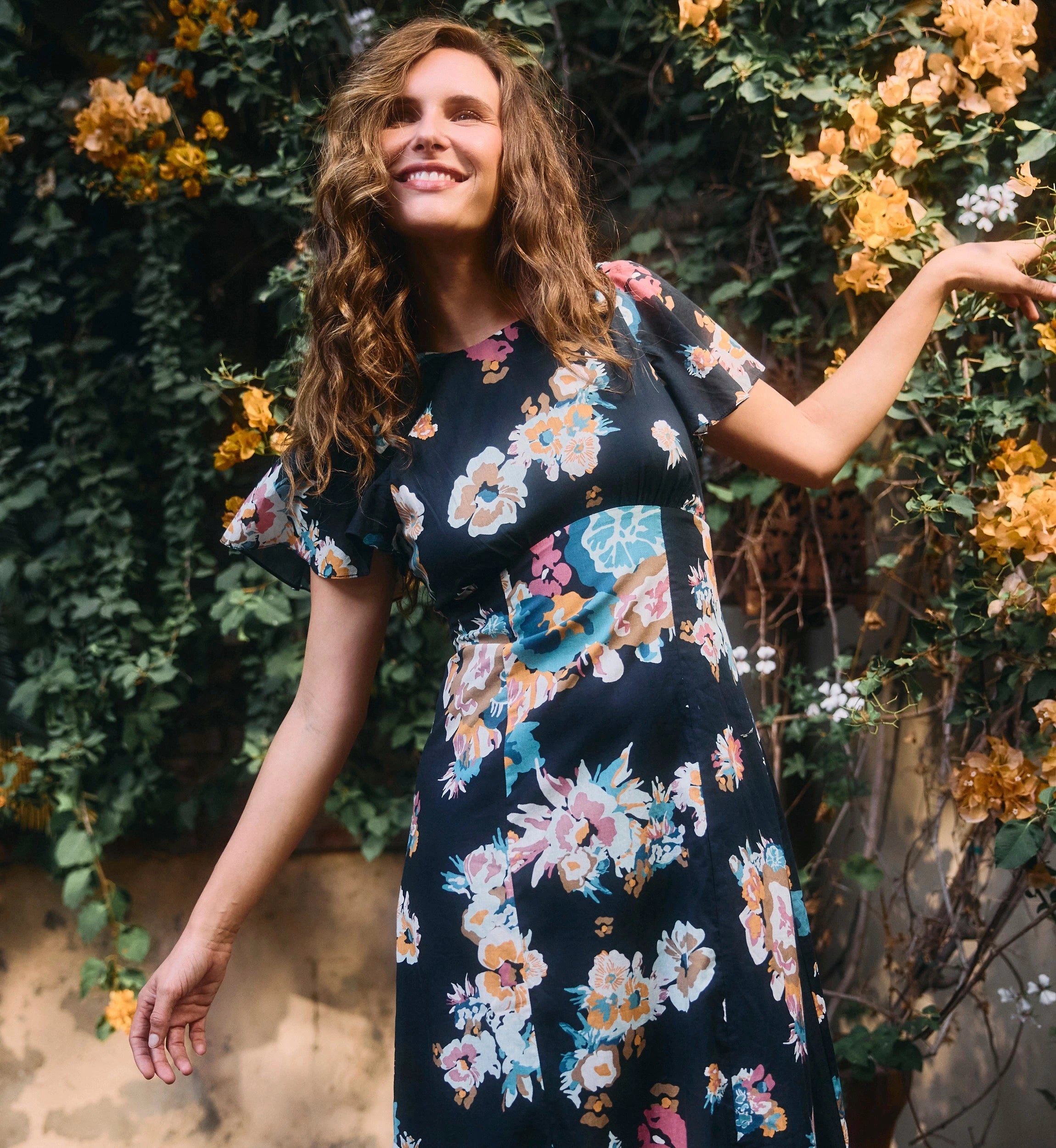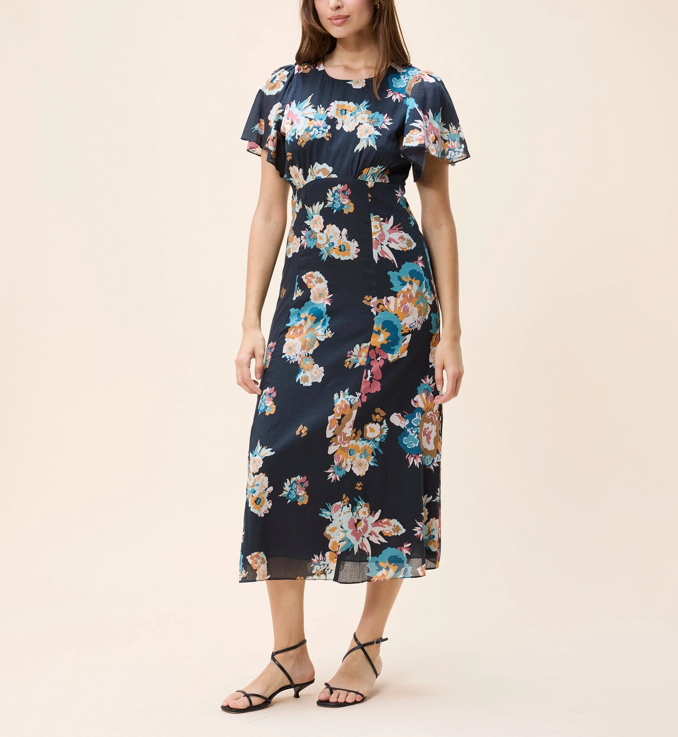 The Elan Midi Dress is an effortlessly romantic silhouette, ethically handmade in India and adorned with vibrant, painterly florals. Designed with an empire waist and soft shirring at the bust, this dress creates a flattering, feminine shape that moves beautifully with every step. Flutter sleeves add a touch of airy elegance, while a subtle keyhole with a button closure at the back enhances the delicate detailing. Finished with a Cleobella invisible zipper at the center back, the Elan Midi Dress blends comfort, craftsmanship, and timeless charm.