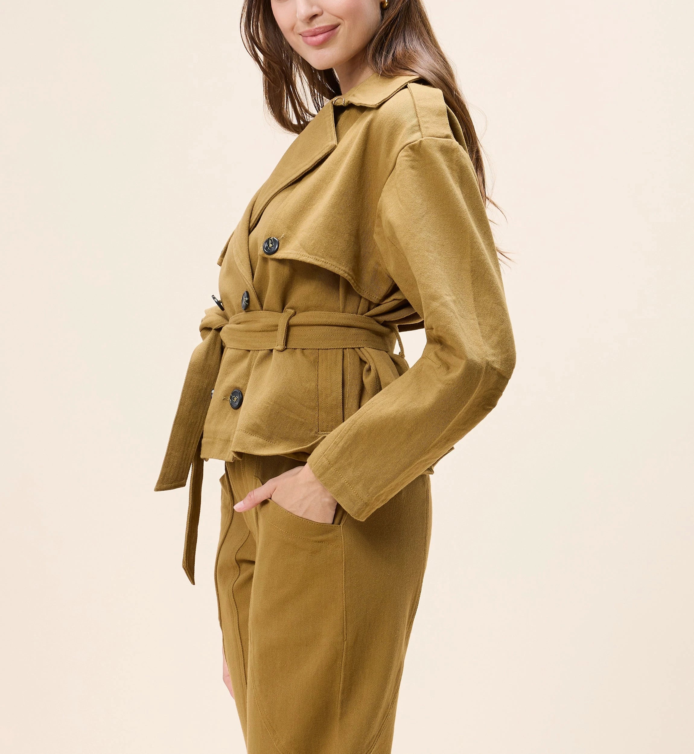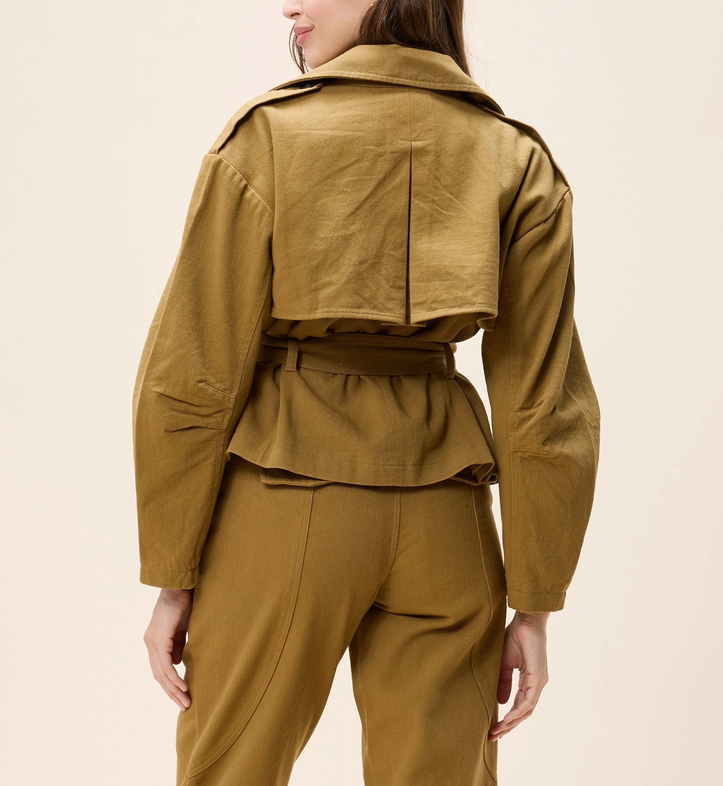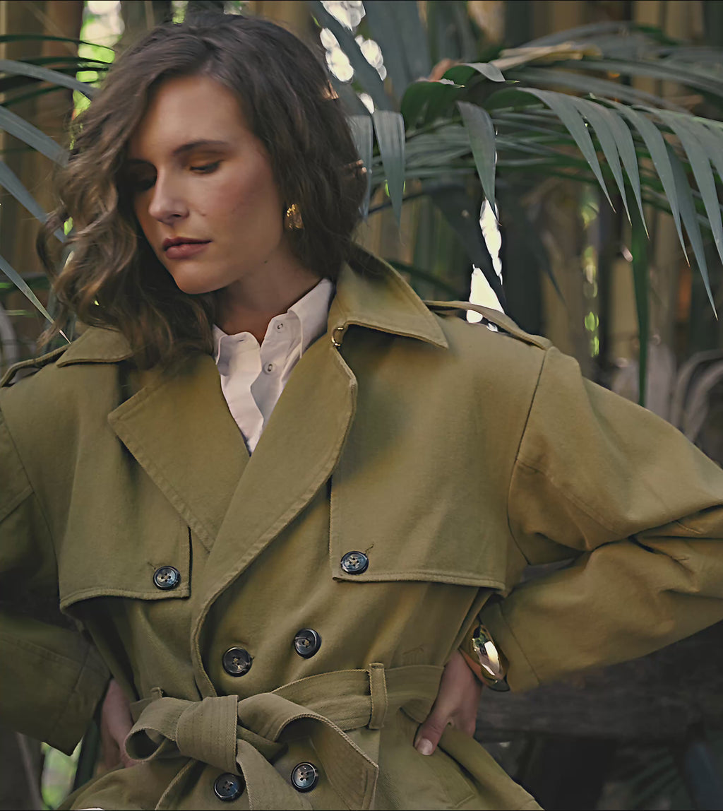 The Hugo Jacket is a contemporary take on a classic twill layer. This double-breasted style features a removable cape and matching sash, allowing you to customize the silhouette to your mood. Structured yet relaxed, it’s the perfect pairing piece for the Leo Pant.