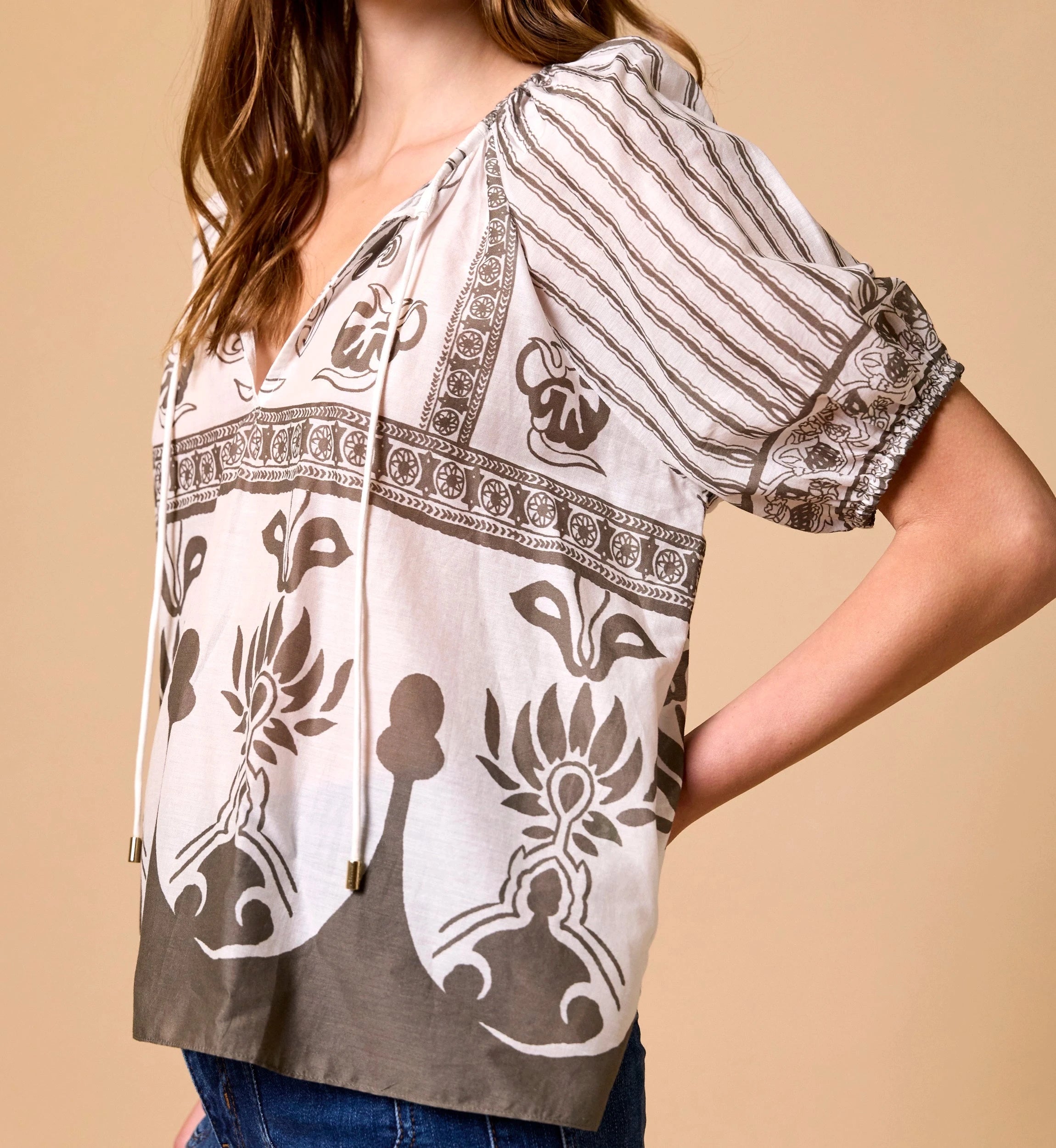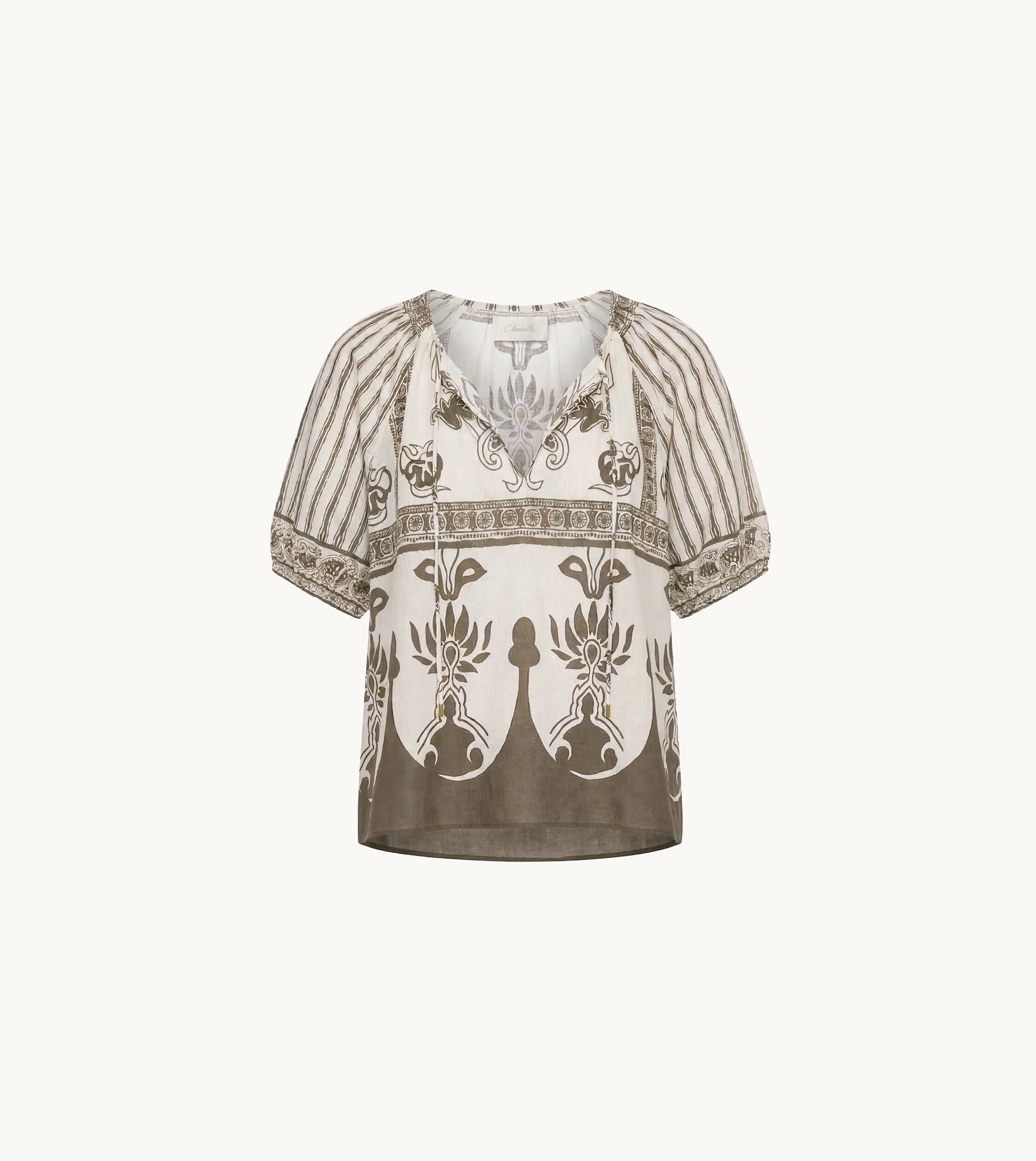 Ethically handmade in India from 100% GOTS certified organic cotton mulmul, the Johana Blouse blends comfort with thoughtful design. Designed with a tie front bodice finished with gold bead ends and raglan-style elasticated sleeves with a printed border edge, it brings subtle detail to an everyday favorite. Pair it with the Holden Short for a relaxed yet elevated look.