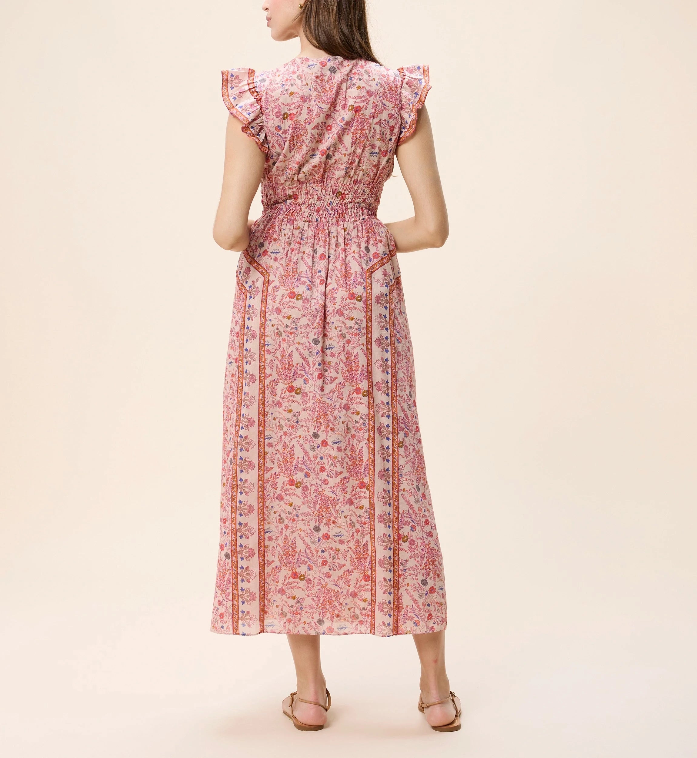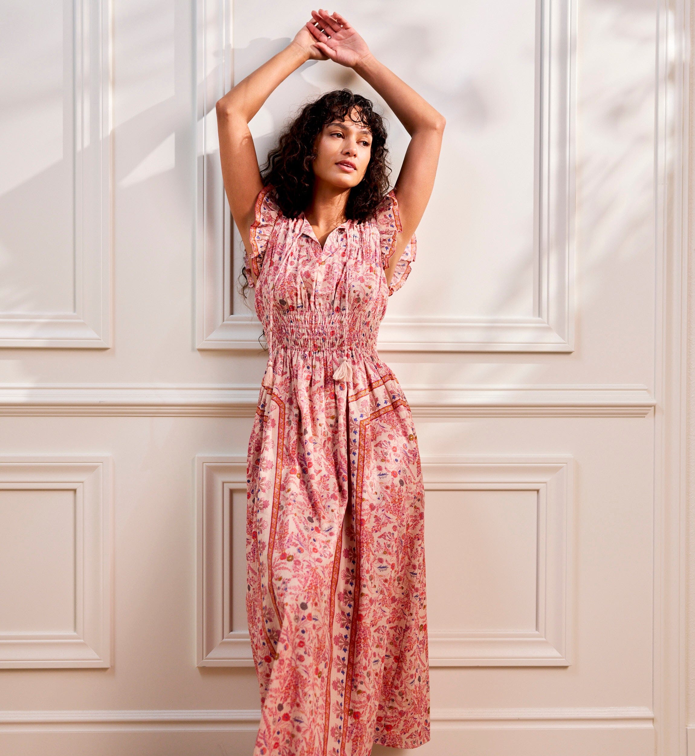 Ethically made in India from GOTS-certified organic cotton mul mul, the Jonni Ankle Dress is designed with a high neckline and fluttering sleeves. The double elastic waist offers comfort and shape, making it an effortless choice for any spring occasion.