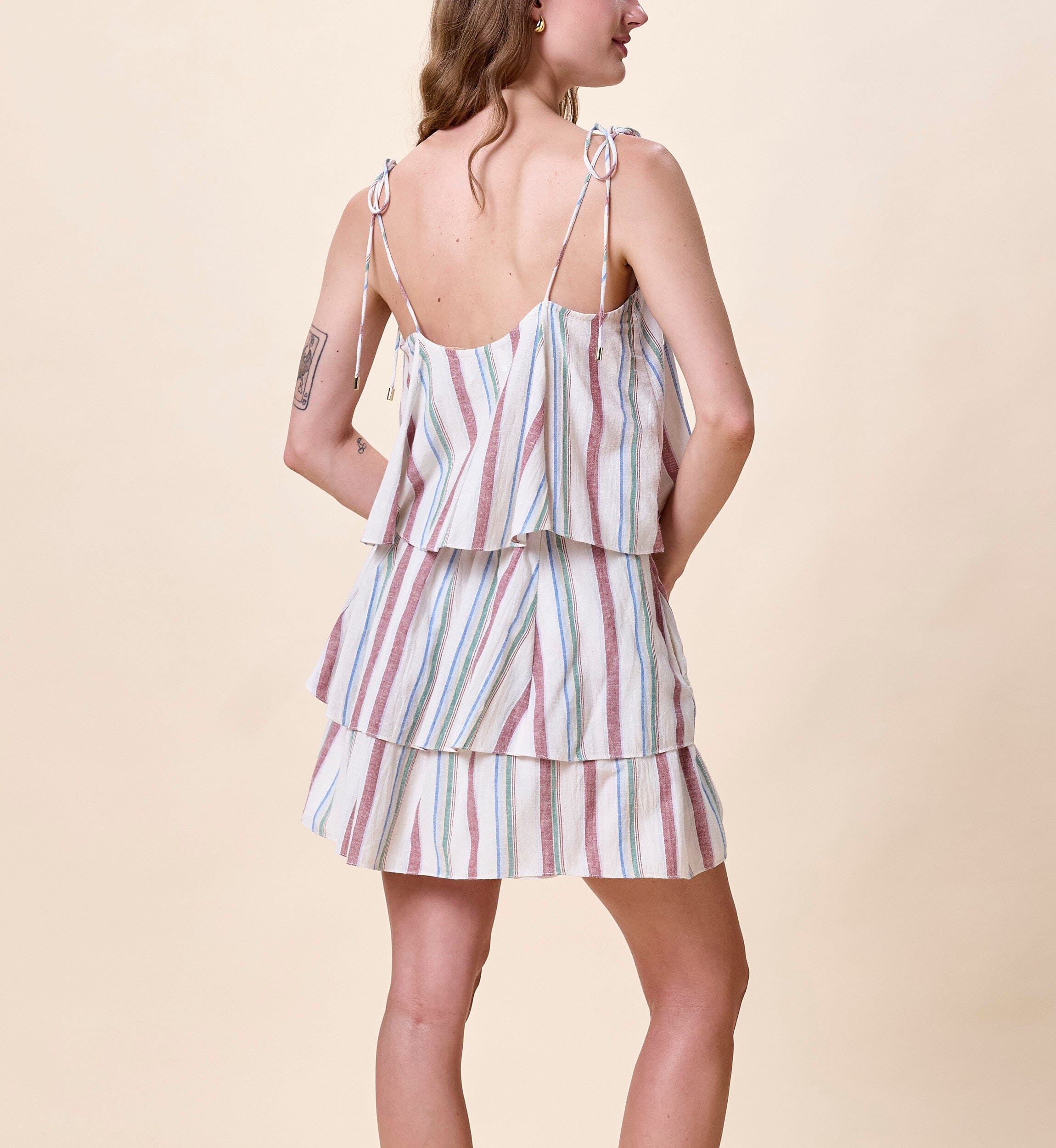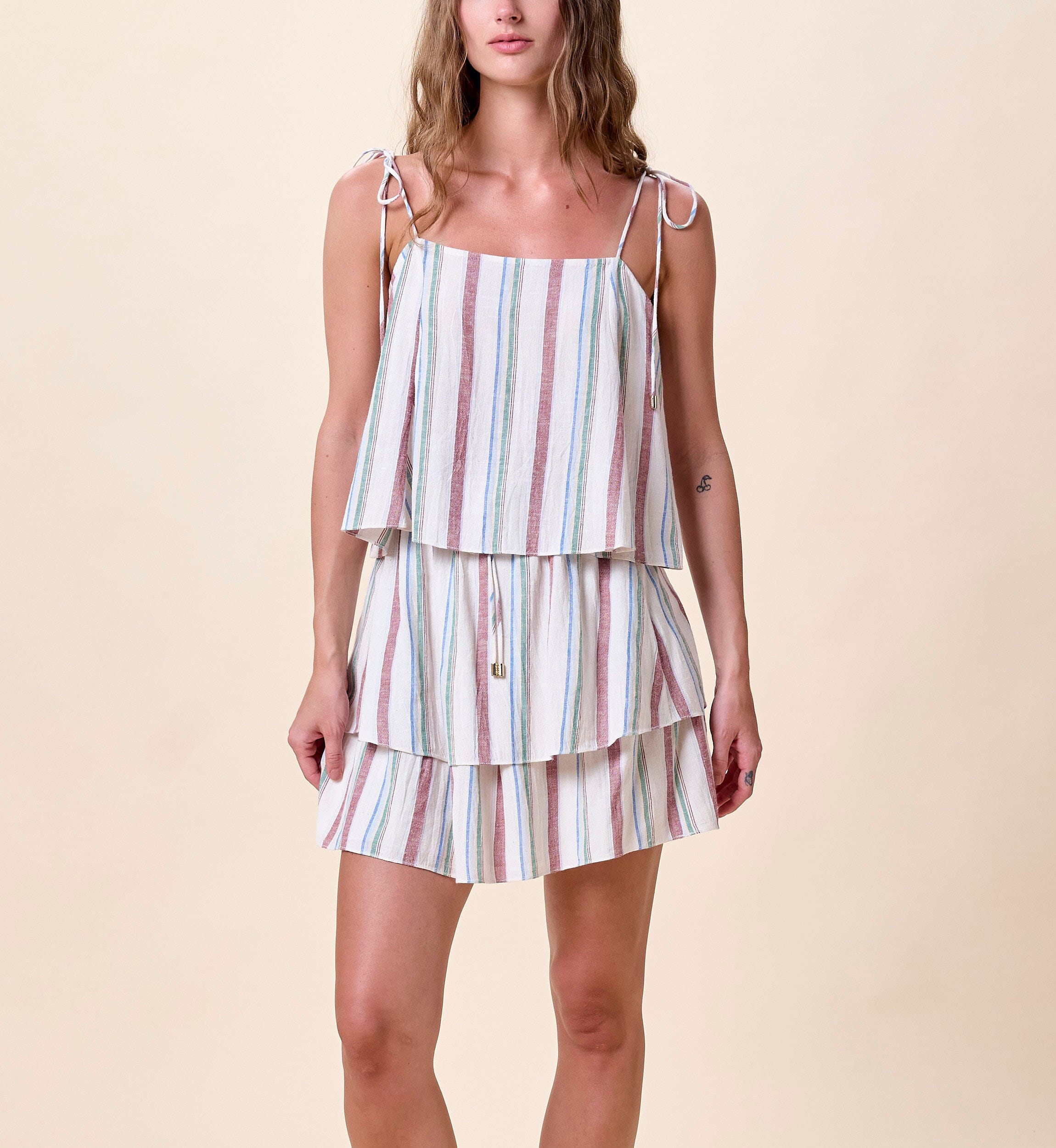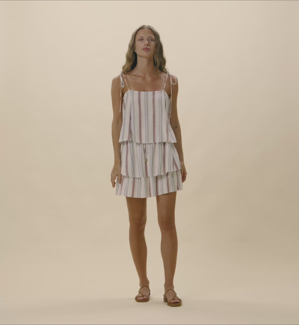 The Leighton Top is your go to this spring. Designed with a relaxed, flowy fit, it features a flattering square neckline and a cropped length that feels light and easy to wear. Adjustable tie straps are finished with delicate gold bead details, adding a subtle touch of charm. Pair it with the matching Lenore Skirt for a perfectly coordinated look that moves with you from day to night.