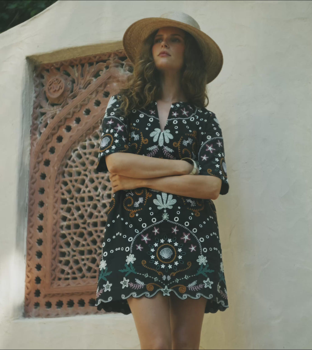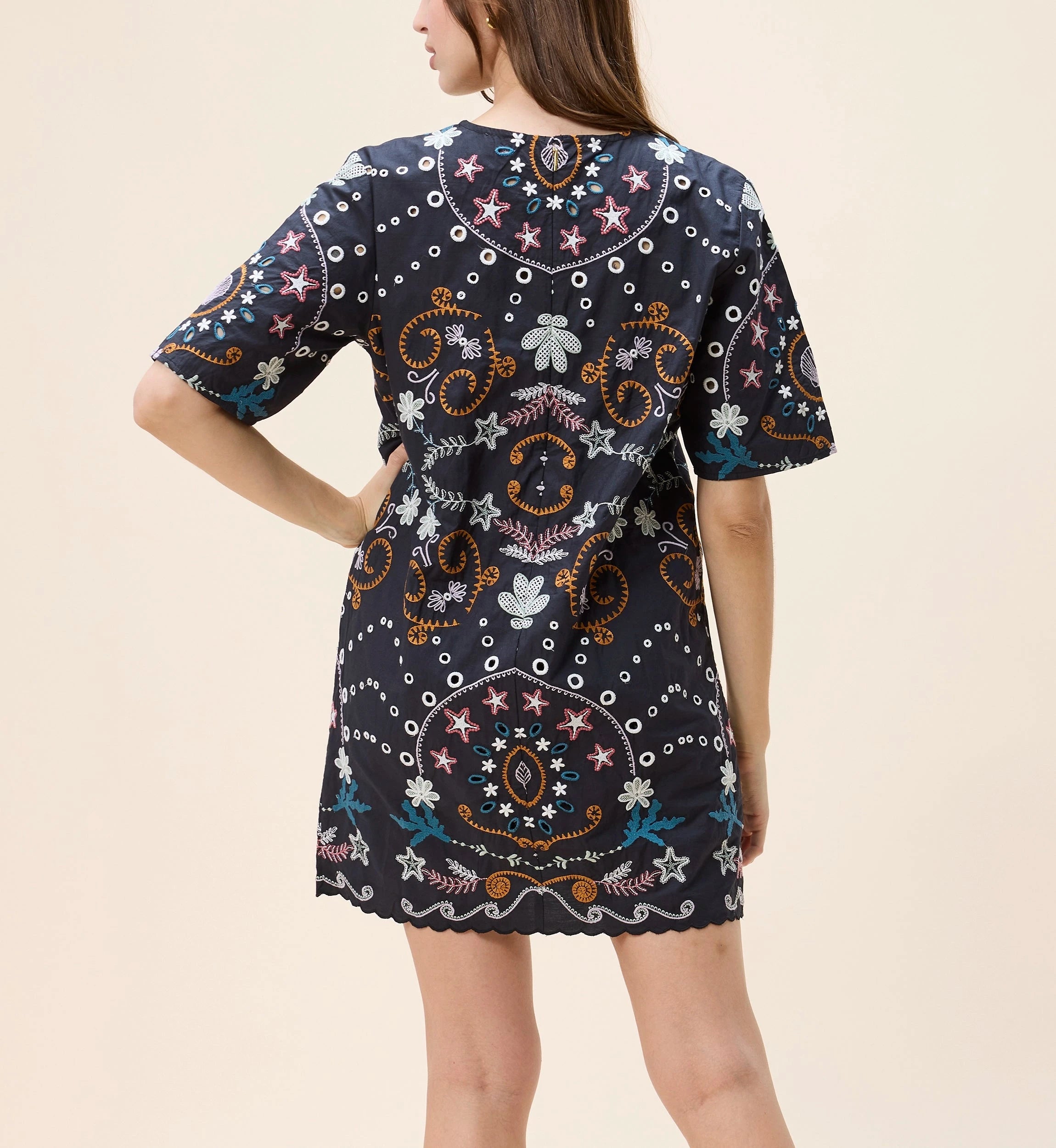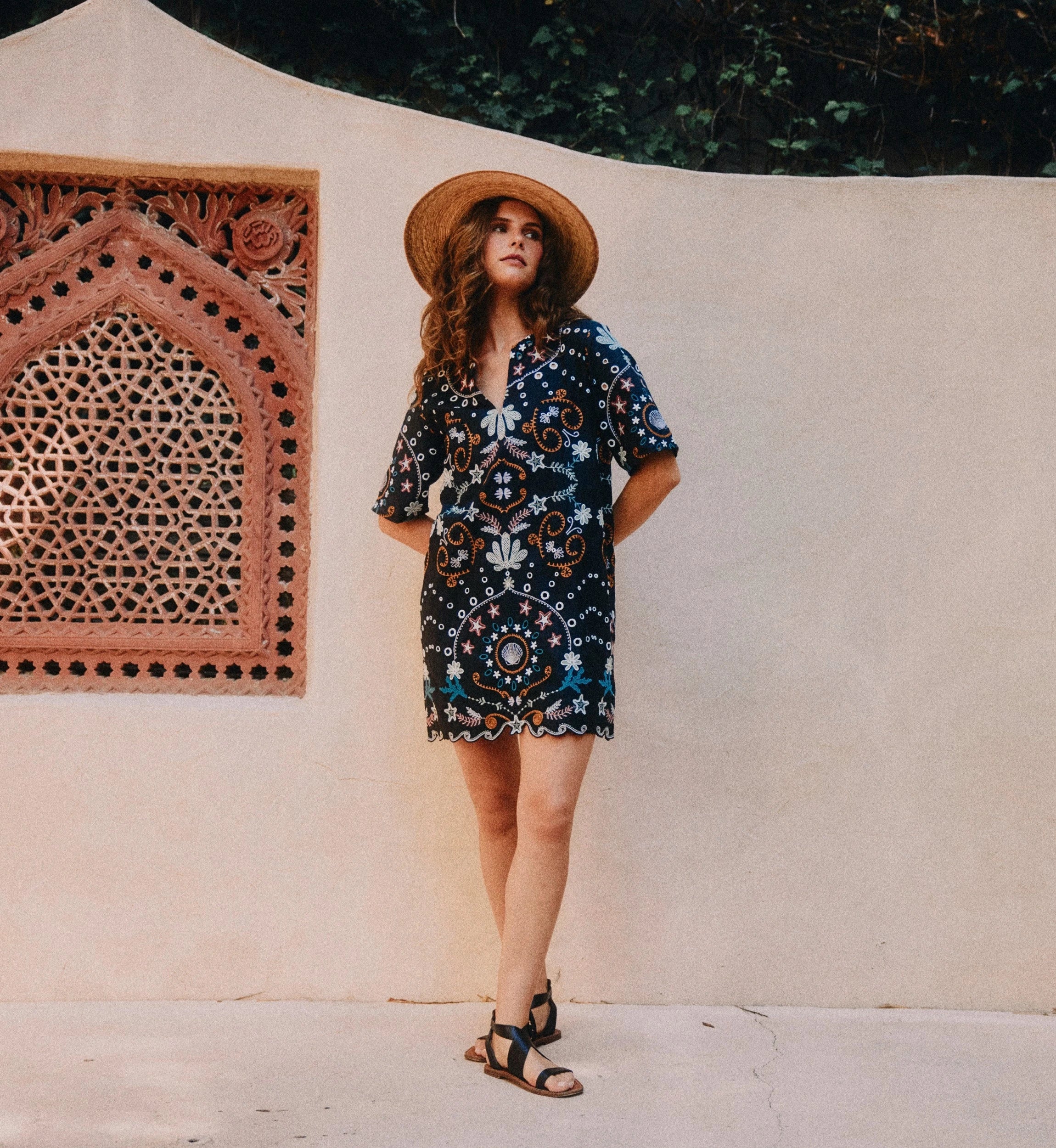 Step into effortless boho style with The Mische Mini Dress. This embroidered mini features a relaxed boxy silhouette, vibrant multicolor stitching, and a breezy split V-neckline—perfect for warm days and easy outings. Finished with a playful scalloped hem and folk-inspired motifs, it’s a standout piece you can slip on and go.