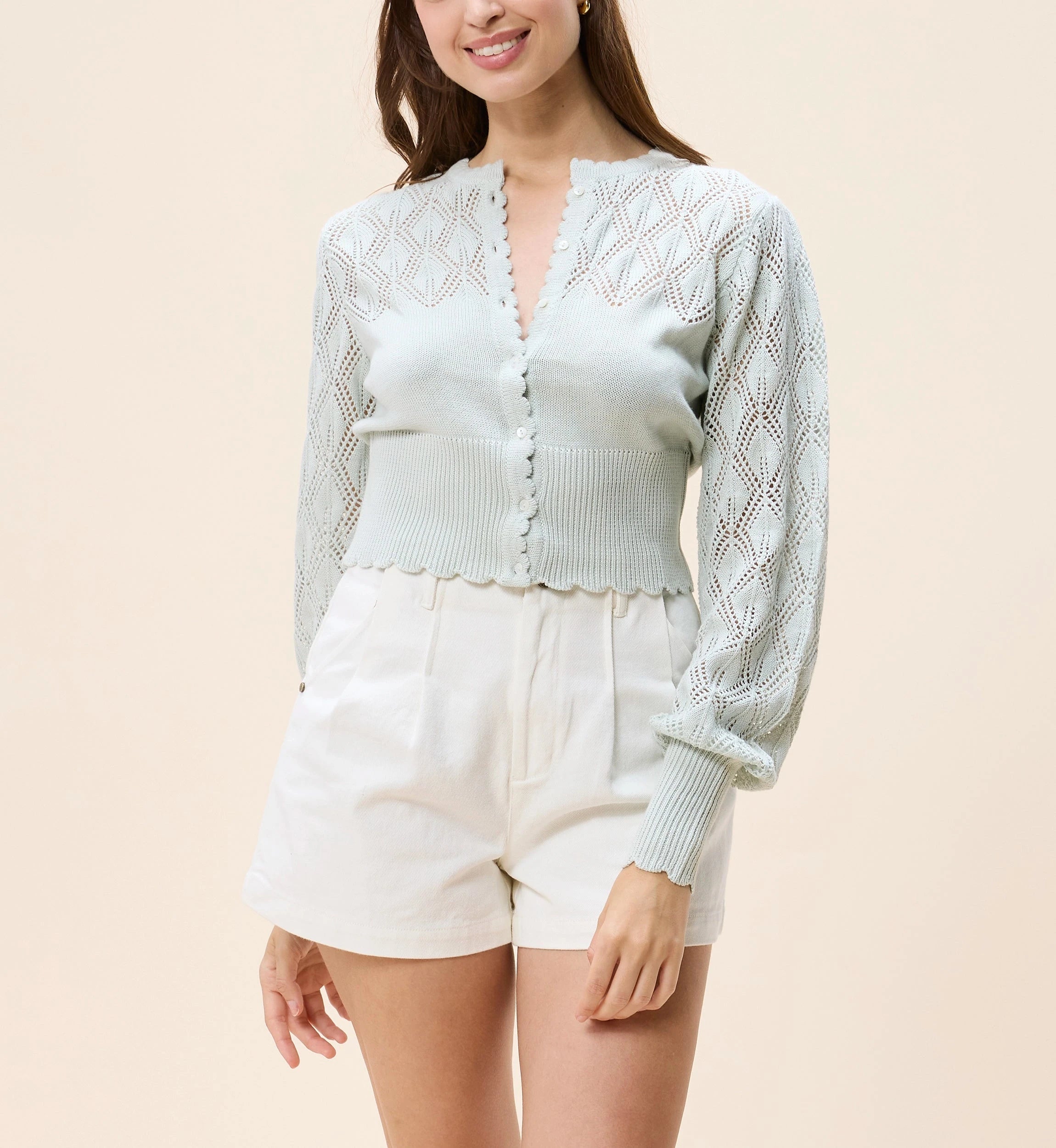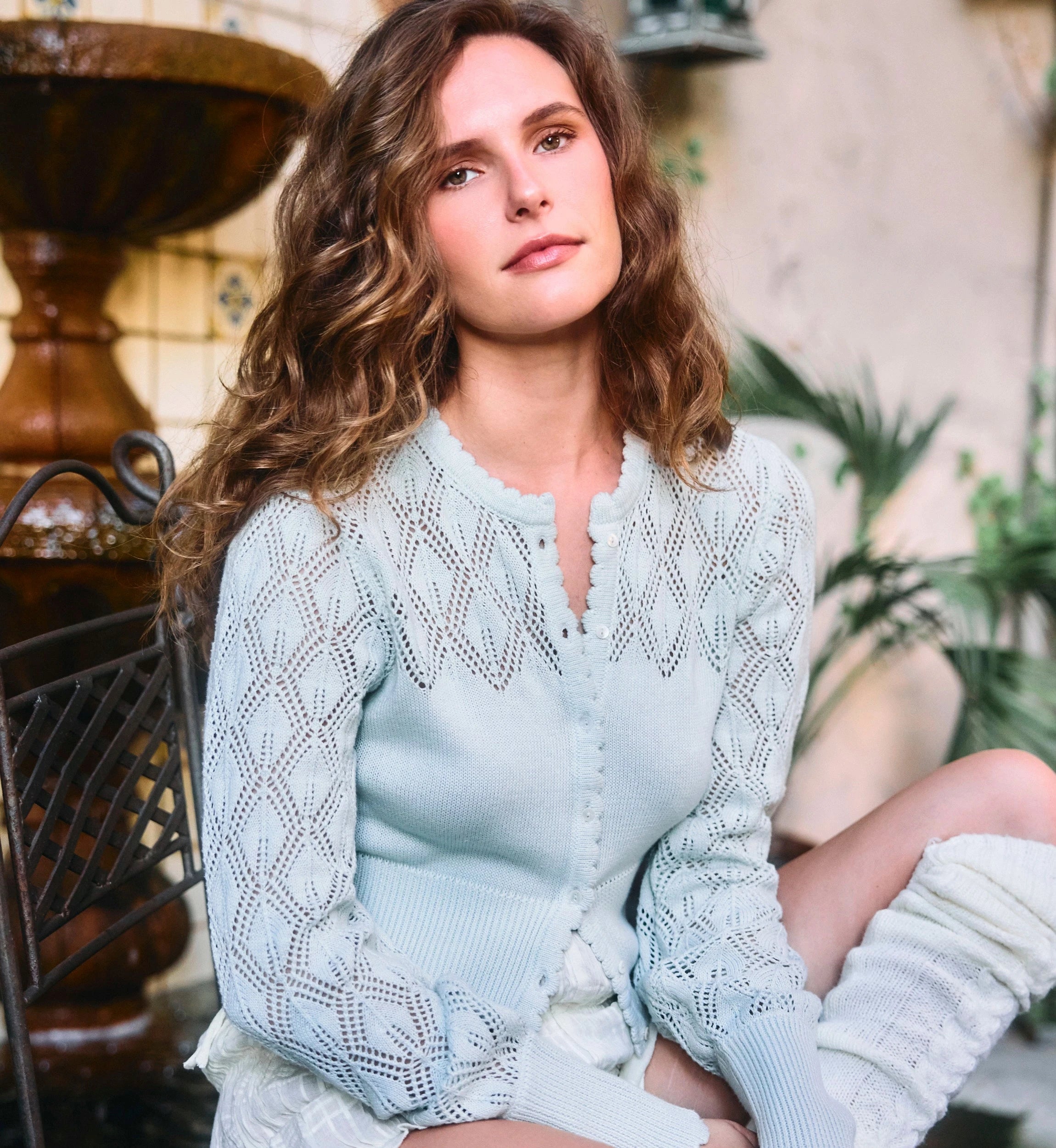 The Roksi Sweater is a beautifully crafted layering essential made from soft organic cotton yarn. This long-sleeve button-down silhouette features an intricate pointelle stitch throughout, adding texture and feminine detail to its timeless design. With delicate scalloping and a flattering, slightly cropped fit, the Roksi brings effortless elegance to both casual and elevated looks.