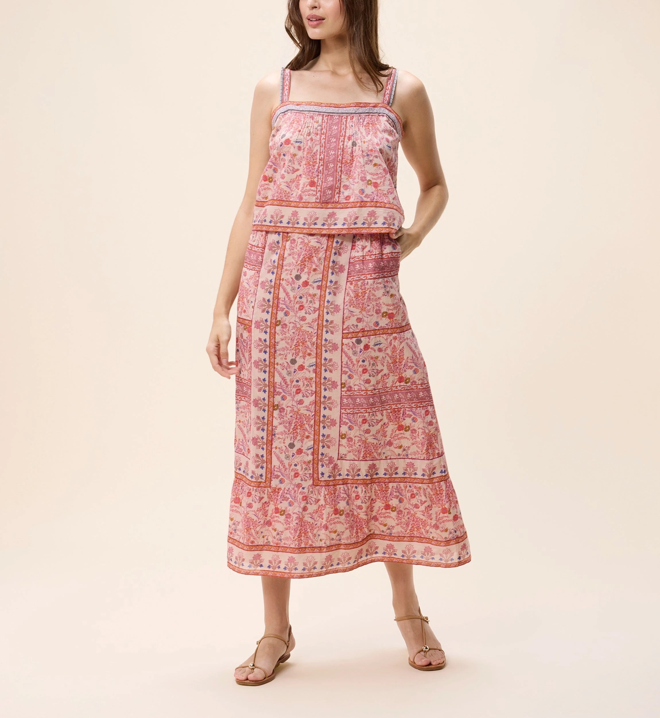 The Yumi Top is an easy spring staple, perfect for pairing with the matching Elie Ankle Skirt or your favorite denim. Crafted from 100% GOTS certified organic cotton mul mul, this slip on style features a cropped, relaxed shape finished with a charming border print for a light, effortless feel.