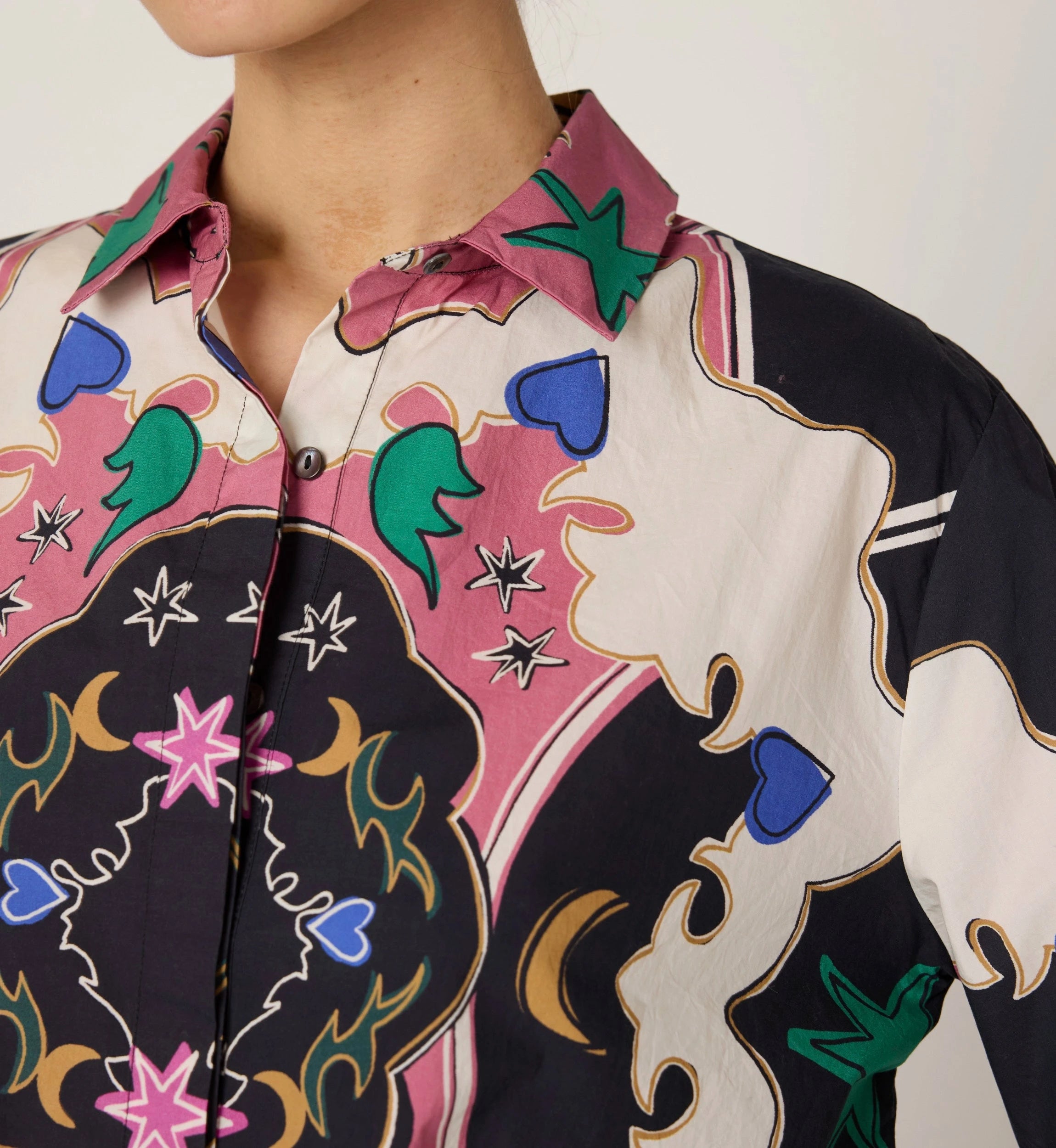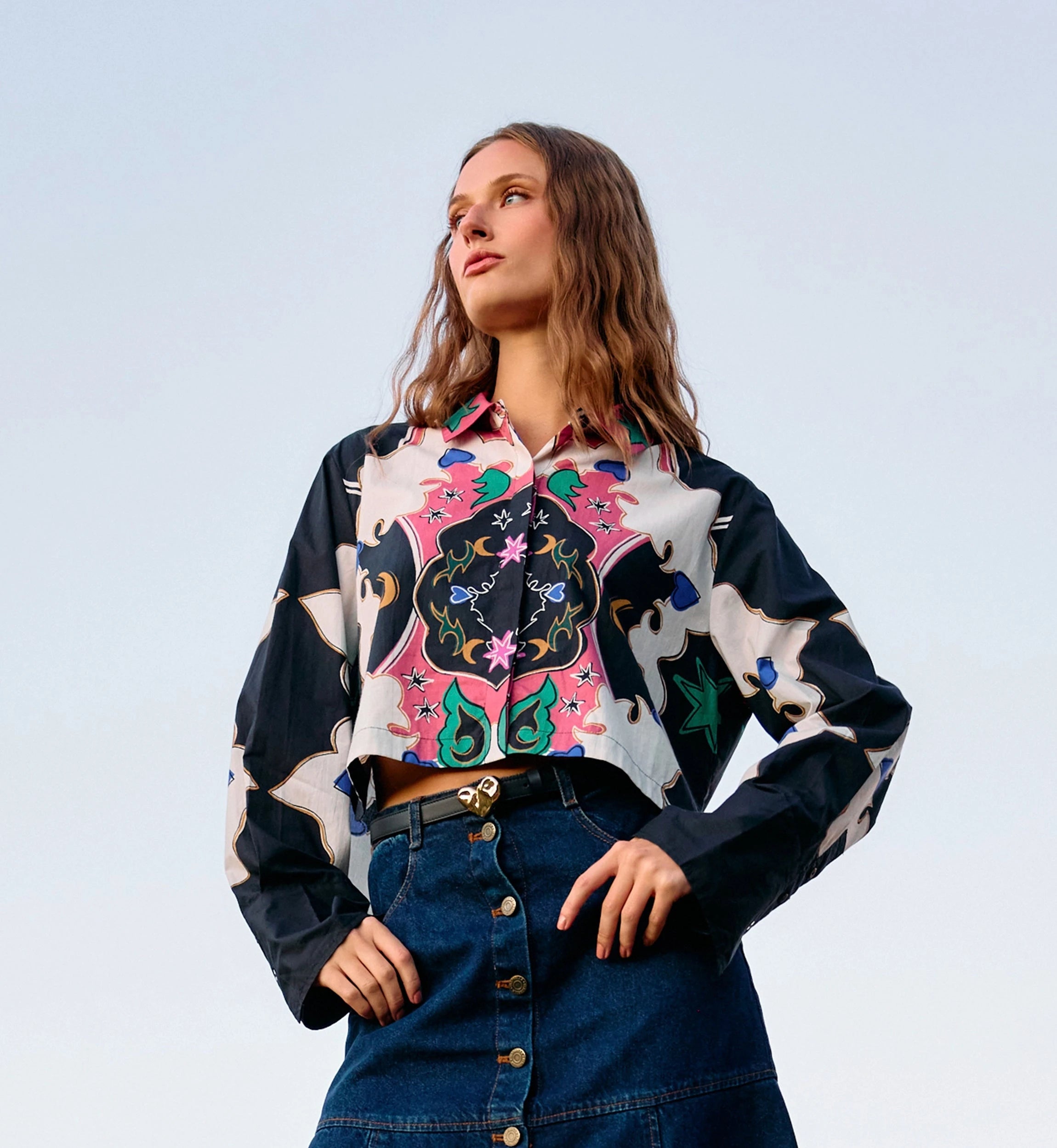 Ethically handmade in India from 100% GOTS-certified organic cotton, the Zoya Blouse brings effortless sophistication to your sustainable wardrobe. This long-sleeve button-down top features an elegant collar, extended cuffs, and an artful print that adds a bold yet refined touch.